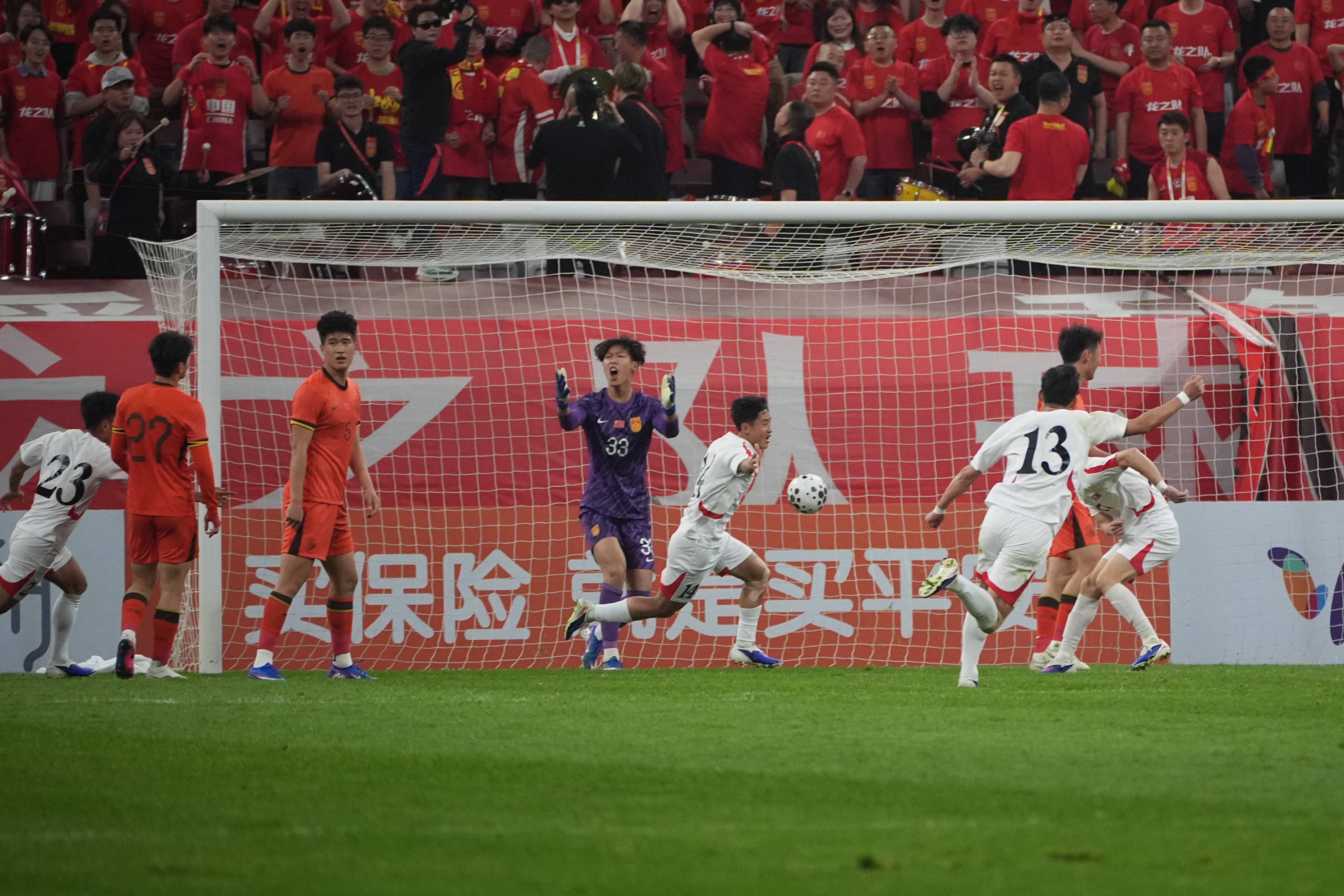 第23分钟,朝鲜队李日成小角度打门被中国队门将姚浩洋挡出,梁光明近距离补射破门,帮助朝鲜队1:0领先结束上半场。