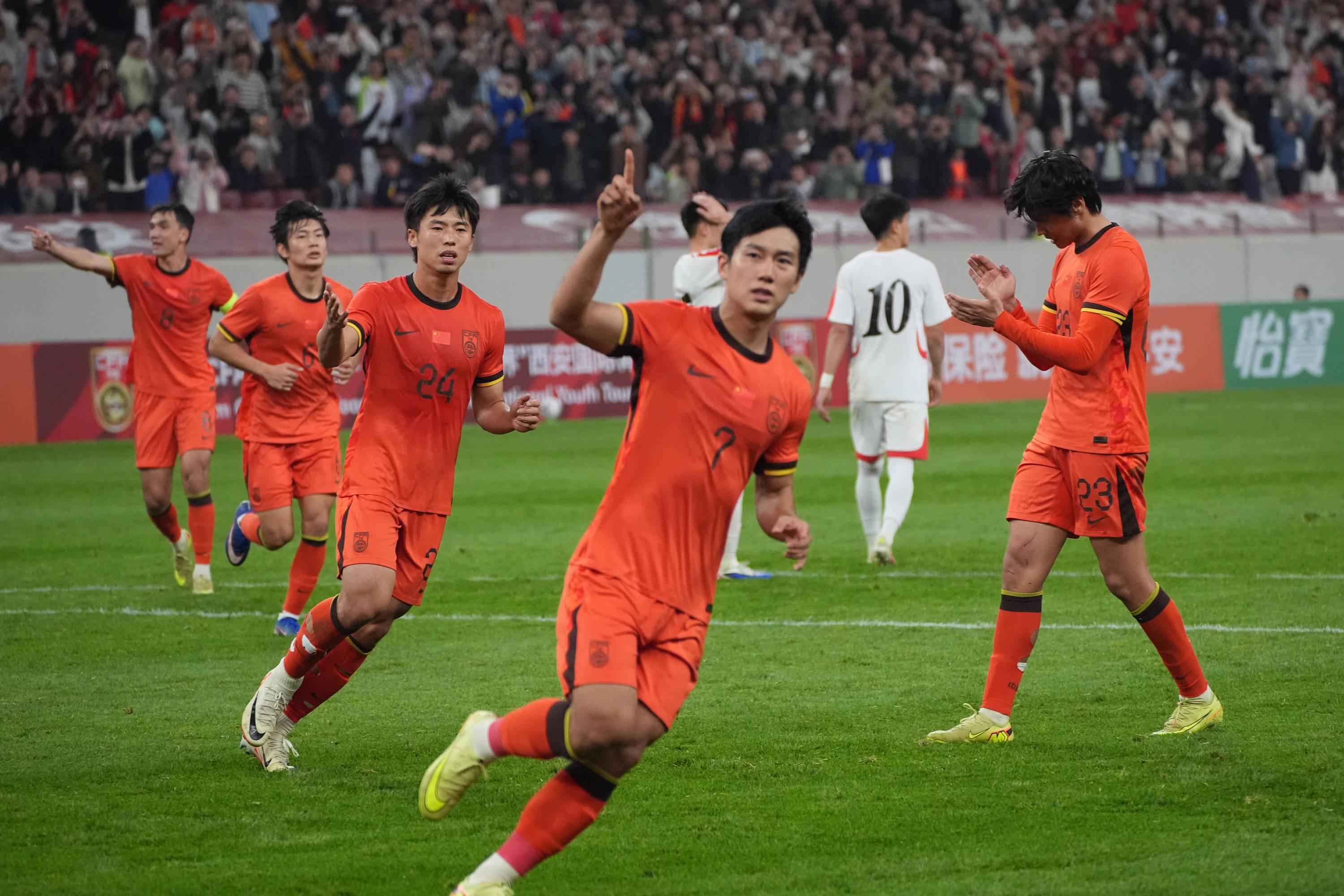 3月28日,中国队球员在打入扳平一球后庆祝。新华社记者 邵瑞 摄“真心感谢西安这座城市,今天我们最后能取得平局,有两点很重要,一个是球迷的支持,再一个是球员们付出的热情。”U23国足主教练安东尼奥赛后点评说。